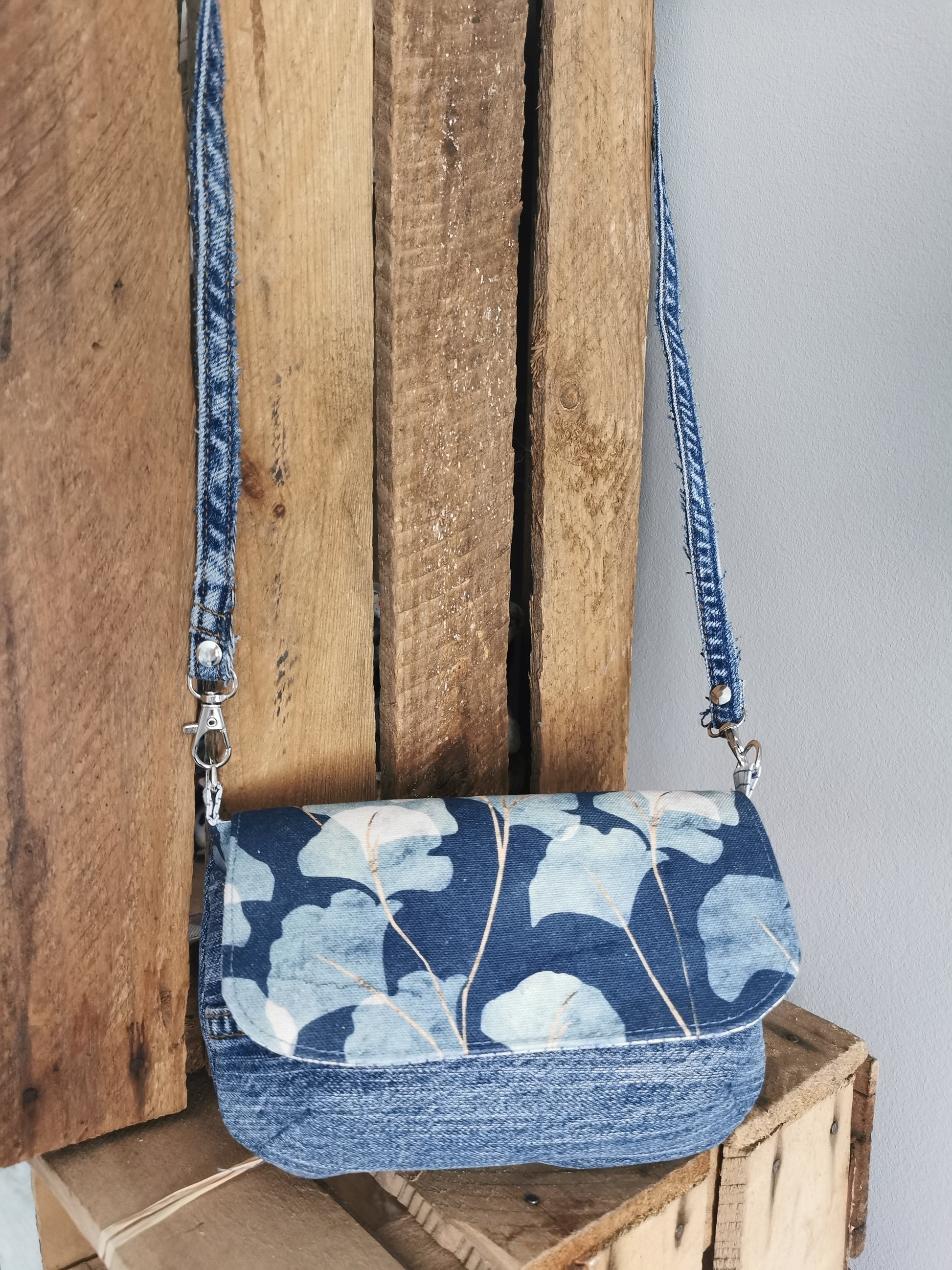 Das Hauptfach wird mit einer Klappe am Steckfach verschlossen. Der Gurt ist ca 144cm lang und nicht verstellbar - auf Wunsch kann die Länge kostenfrei angepasst werden. Da das Gurtband von einer Jeanshose ist, kann es mit der Zeit vorkommen, dass sich einzelne Fäden lösen (das Gurtband bleibt dadurch weiterhin intakt). Diese Fäden können mit einer herkömmlichen Haushaltsschere entfernt werden. Wer diesen zerfransten Look mag, lässt sie einfach dran.